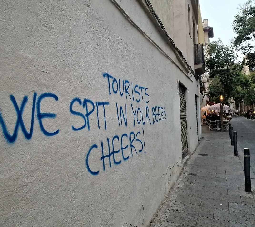 欧洲一些城市的建筑涂鸦上,时常能看到“游客回你们自己家”“这里不欢迎游客”的类似字样。
