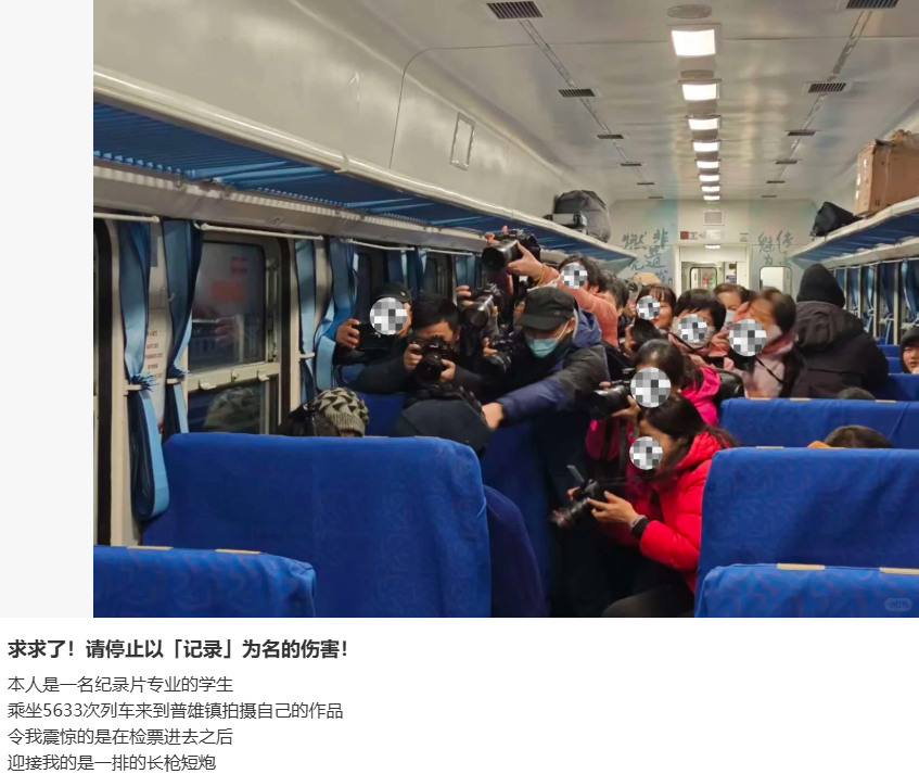 这次“围堵怼脸拍”事件让很多人质疑,所谓的纪实摄影会不会打扰当地乘客,是否会造成以记录为名的伤害。